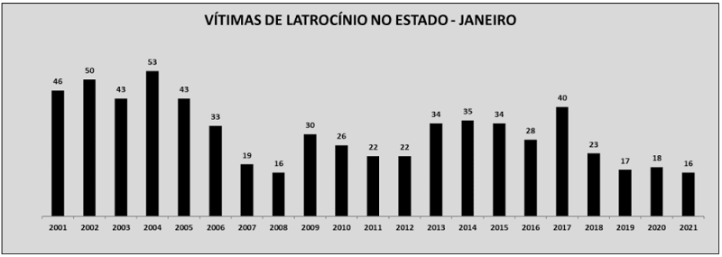 Os roubos seguidos de morte, tanto a quantidade de casos como de vítimas, passaram de 18 para 16, se comparado janeiro de 2020 e 2021 – dois a menos. A quantidade de ocorrências é a segunda menor da série histórica, ao lado de 2007, enquanto que o número de vítimas é o menor, ao lado de 2008.