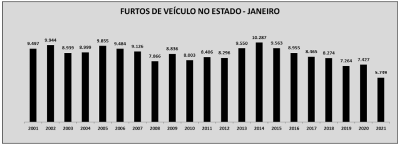 Todas as modalidades de furtos caíram no mês passado, se comparado a janeiro de 2020. Os furtos em geral recuaram 20,2%, passando de 43.791 para 34.960 – 8.831 a menos. Os furtos de veículos diminuíram 22,6%, com o registro de 5.749 boletins no primeiro mês de 2021, ante 7.427 em igual mês do ano anterior. Os dois indicadores tiveram as menores quantidades da série histórica.