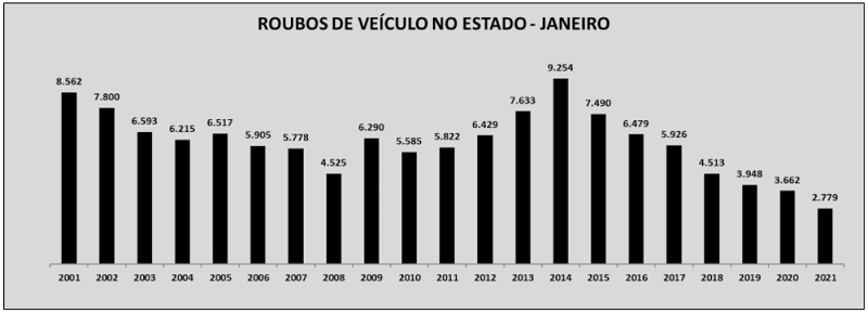Nos roubos em geral a redução foi de 19,8%, passando de 23.997 para 19.240, e nos roubos de veículos a queda foi de 24,1%, passando de 3.662 para 2.779. Este último indicador também apresentou o menor número da série histórica.